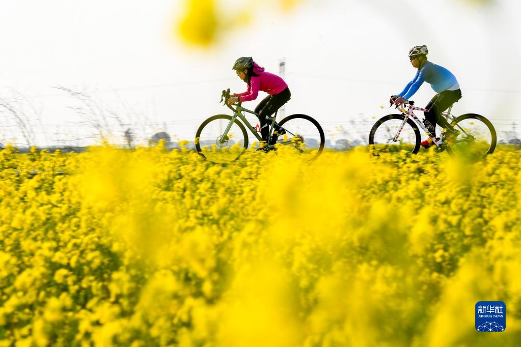 2月21日,骑行爱好者在江西省樟树市永泰镇官湖村油菜花海中骑行、赏花。