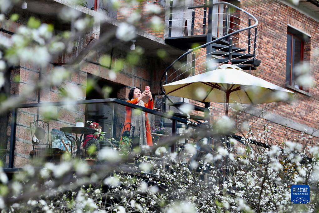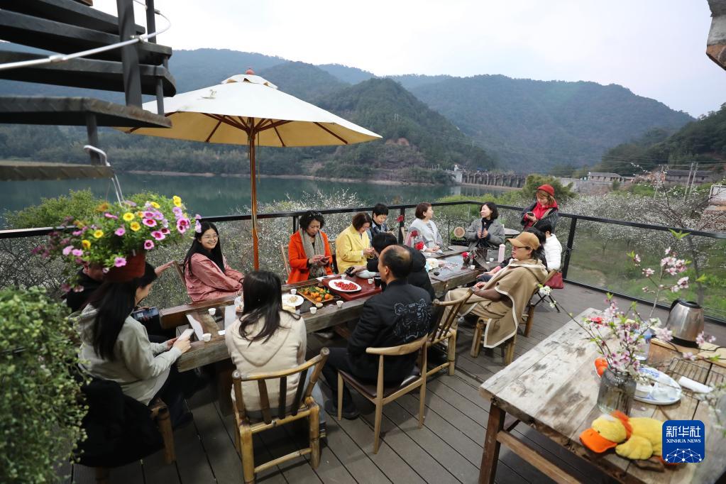 福州市永泰县嵩口镇大喜村游客在李花环绕的观景台上聊天(2月24日摄)。