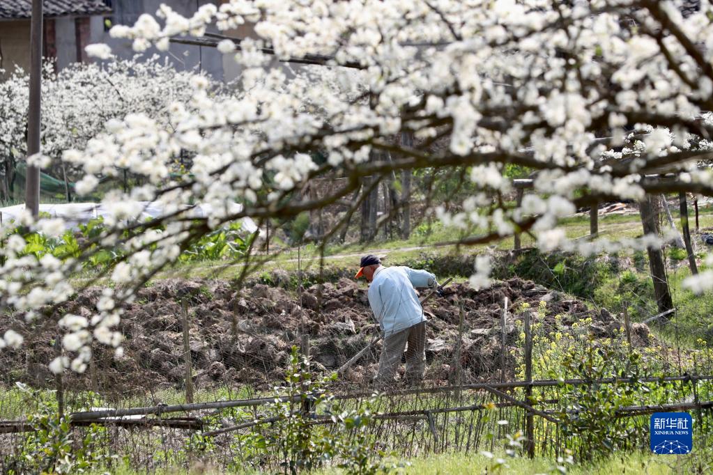 福州市永泰县盖洋乡前湖村村民在李树旁劳作(2月24日摄)。