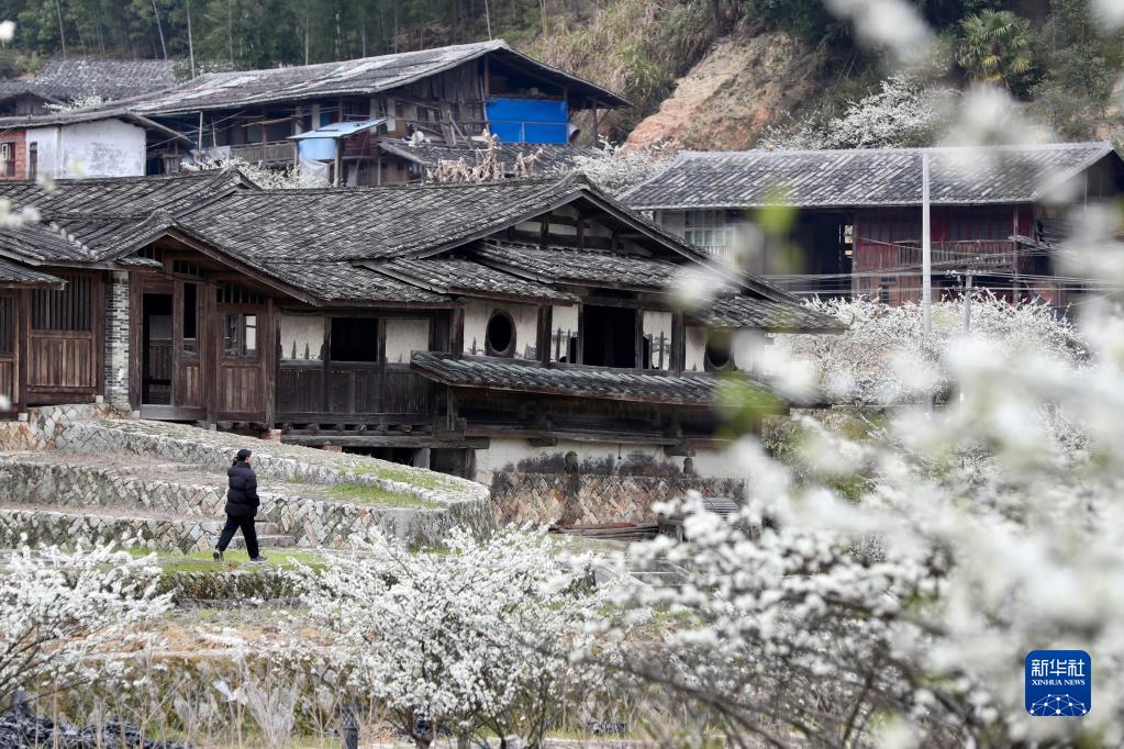 福州市永泰县盖洋乡盖洋村“三对厝”周围盛开的李花与古厝相映成趣(2月24日摄)。