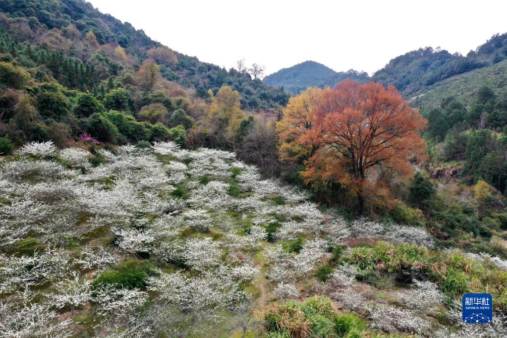 福州市永泰县嵩口镇大喜村山坡上李花盛开,春意盎然(2月24日摄,无人机照片)。