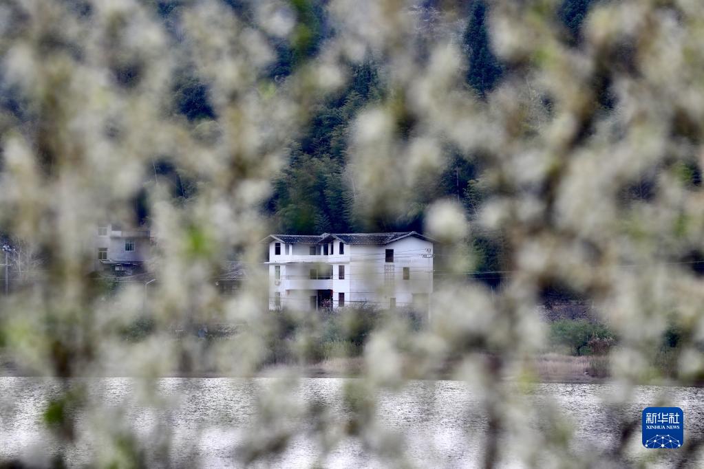 福州市永泰县嵩口镇大喜村一处李花掩映下的湖边民居(2月24日摄)。