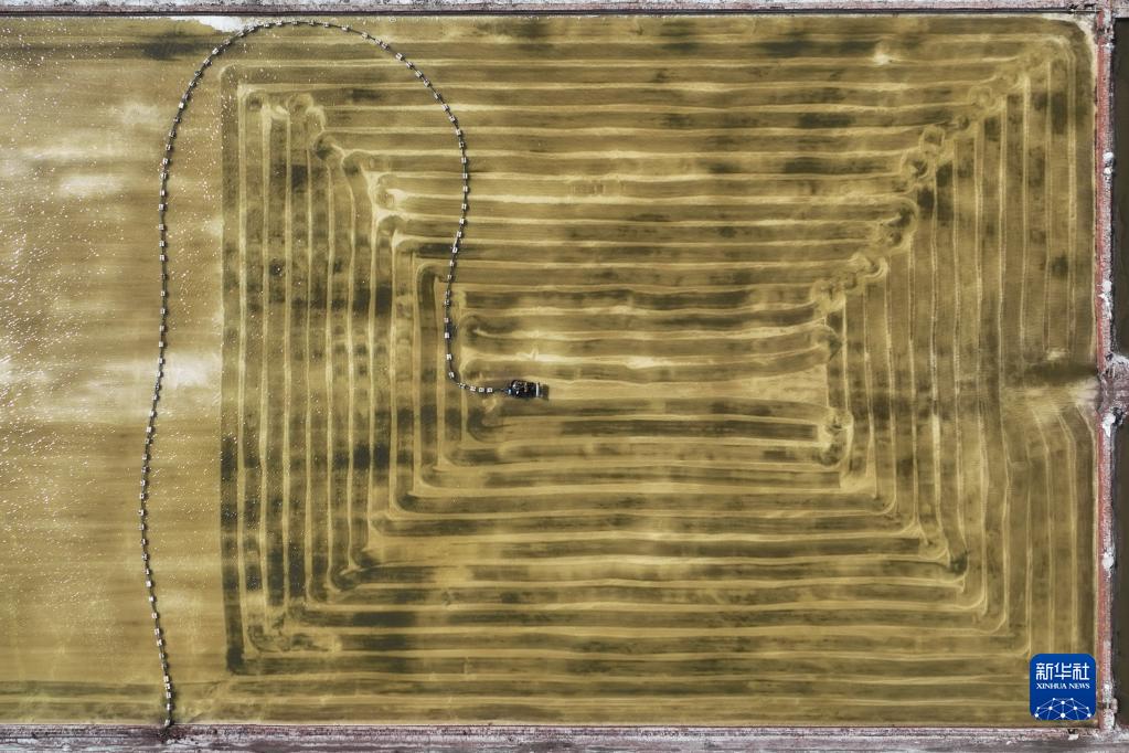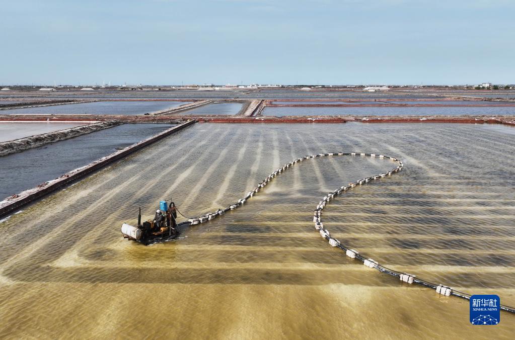 5月14日,唐山市曹妃甸区南堡盐场的工人在盐田内使用机械设备收获春盐(无人机照片)。