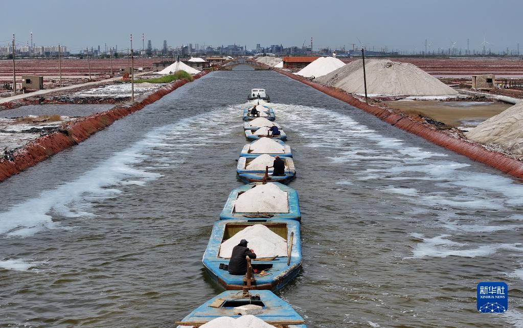 5月14日,唐山市曹妃甸区南堡盐场的工人在将收获的春盐运出盐?。ㄎ奕嘶掌?。