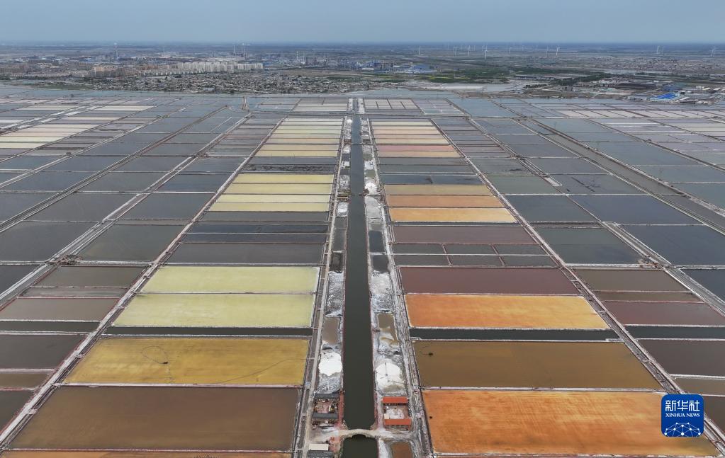 5月14日,唐山市曹妃甸区南堡盐场的工人在整理春盐。