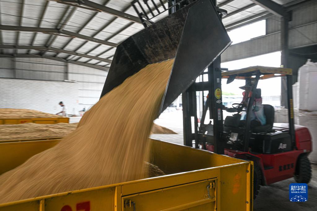 6月4日,在位于海南省东方市的海南农乐南繁科技有限公司制种基地,工人驾驶叉车将收获的稻种运入烘干仓。