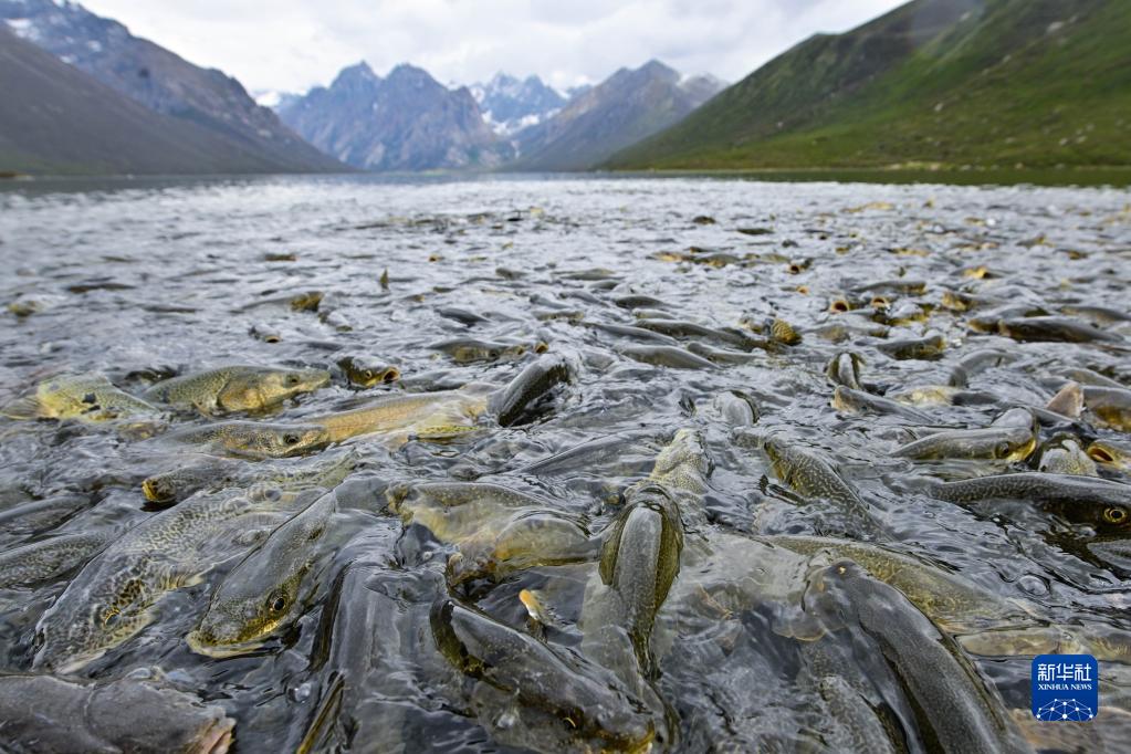6月11日,在青海省果洛藏族自治州久治县境内的年保玉则,裸鲤在水中活动。