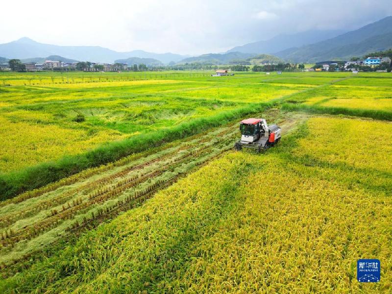 8月17日,收割机在福建省南平市浦城县石陂镇申明村田间收割水稻(无人机照片)。