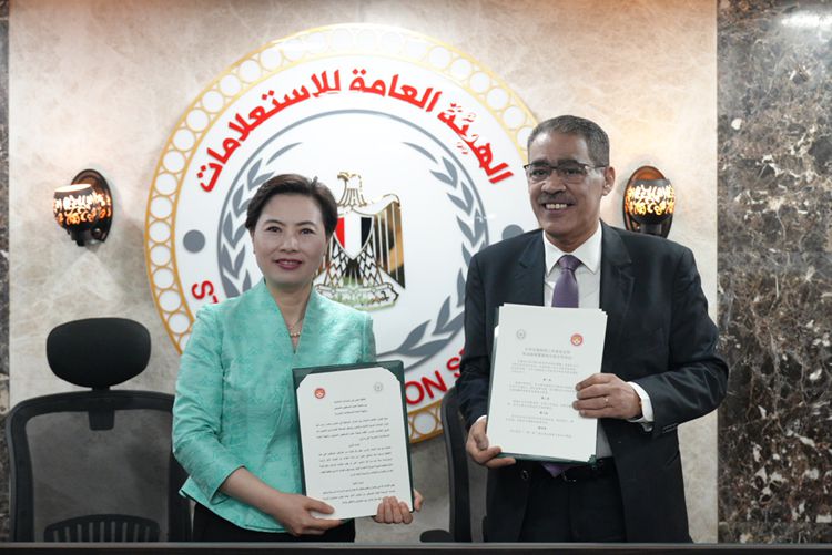 中国新闻代表团团长,中国记协党组成员、书记处书记吴旭(左)与埃及新闻署署长迪亚·拉什万共签协议。陈天喆 摄