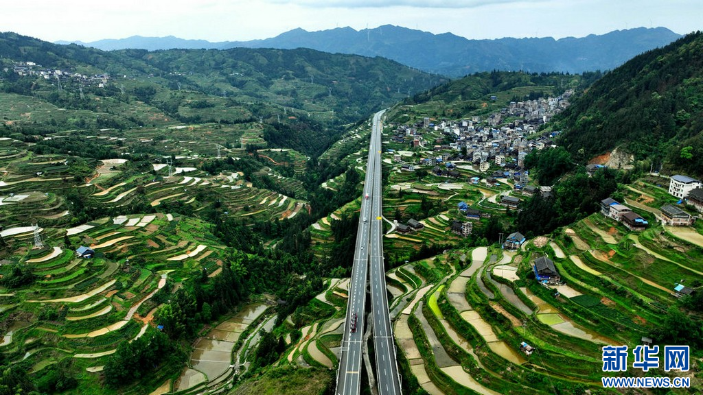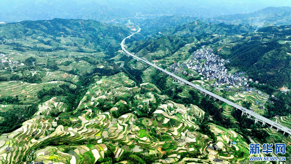 近日,在广西三江侗族自治县独峒镇,新耕作的梯田蓄水充盈,宛若层层明镜遍布山间,与绿意盎然的田野、独具特色的侗寨民居、穿梭而过的高速公路相映成趣,美不胜收。(龚普康梁秀明)