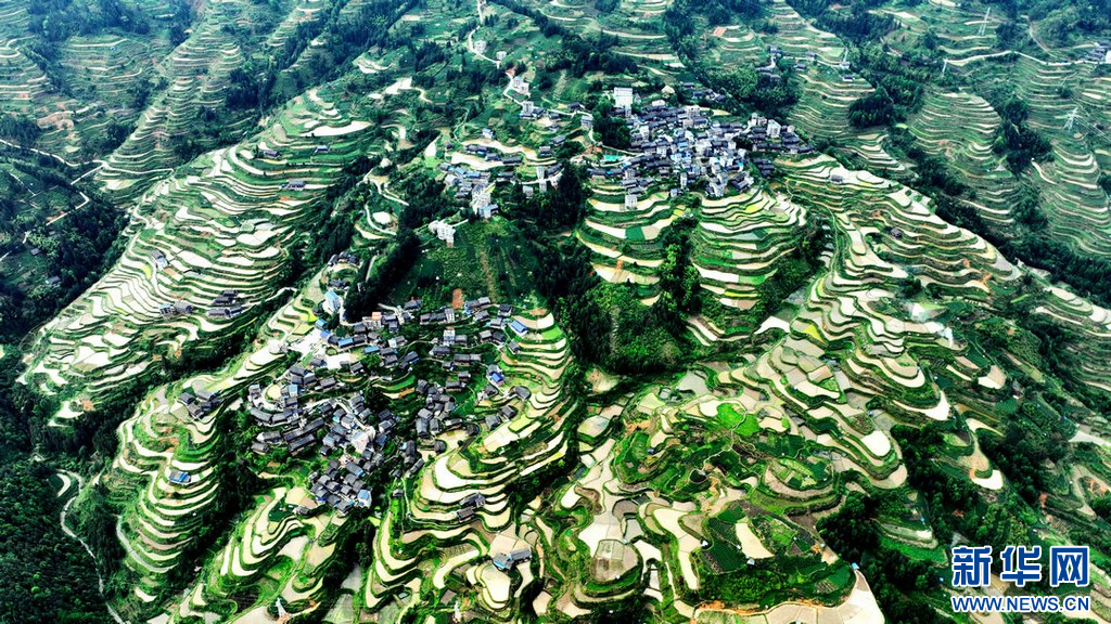 蓄水充盈的梯田层层叠叠遍布山间,与侗寨民居相映成趣。
