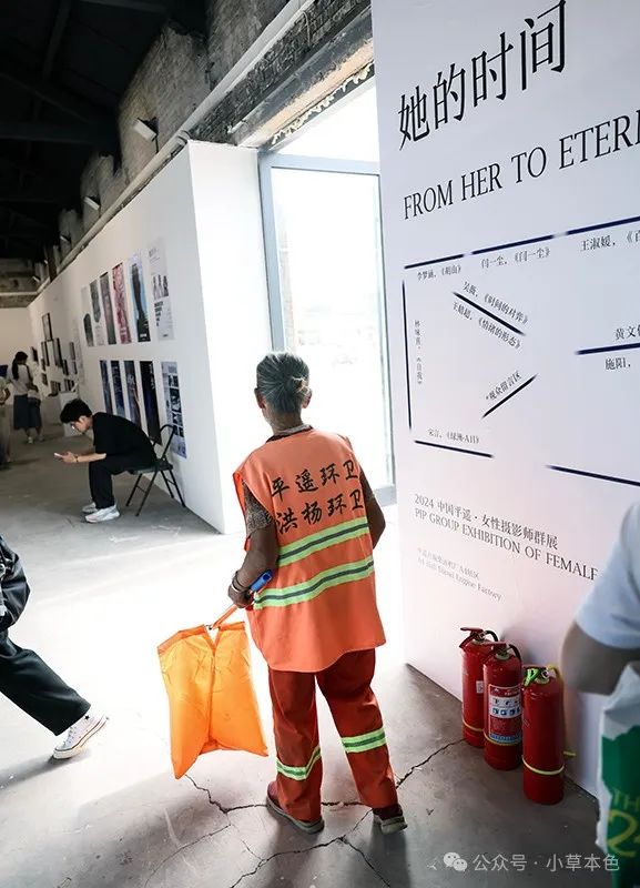 2024年9月19日,一名“轻伤不下火线”的摄影师在第24届平遥国际摄影大展展场内拍摄