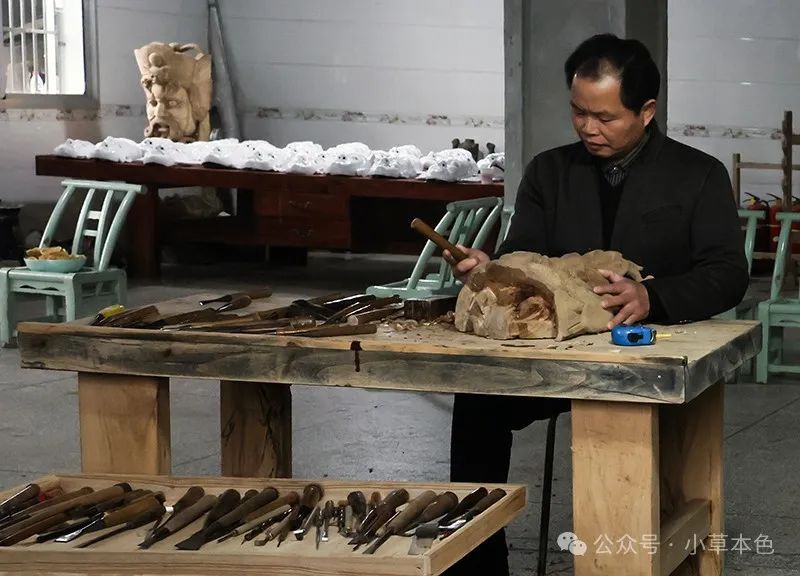 彭国龙是江西省萍乡市湘东区腊市镇救塘村人,是当地有名的傩面具雕刻艺人和傩面具雕刻技艺传承人。萍乡湘东傩面具风格古朴细腻,工艺复杂讲究,2006年被列入第一批国家级非物质文化遗产名录。彭国龙子承父业,14岁就跟随父亲学习油漆、雕傩等技艺,至今已近40载,在继承传统傩面具雕刻技法的同时,还揉入现代元素,使作品贴近生活、彰显个性。对于彭国龙来说,傩面具雕刻已不仅是谋生工具,更是一种对传统傩文化的继承和弘扬