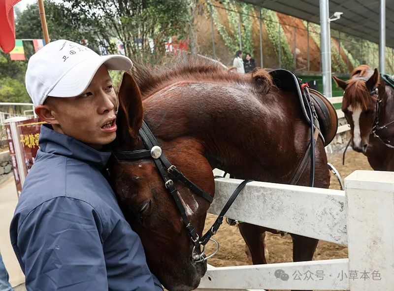 2024年12月13日,江西省萍乡市湘东区和平农场马术俱乐部,一匹赛马将自己的头紧紧贴在骑手的怀里