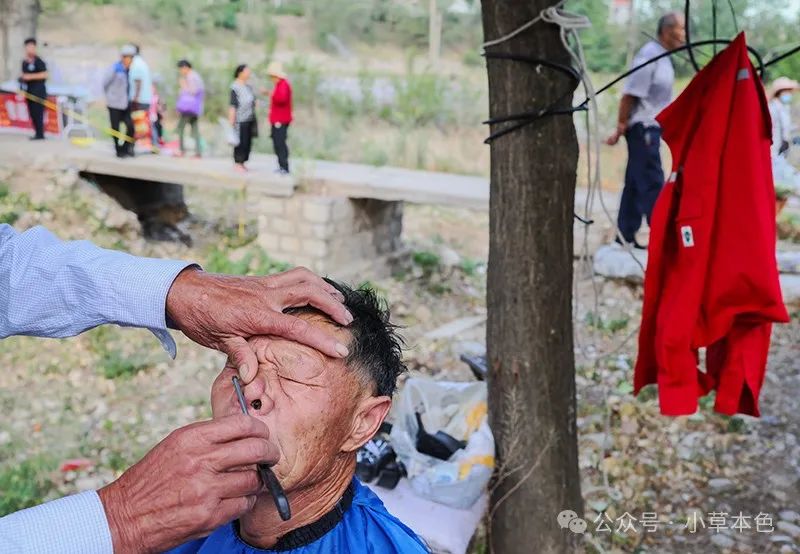 2024年6月11日,山东省淄博市峨庄大集上理发师为顾客刮脸