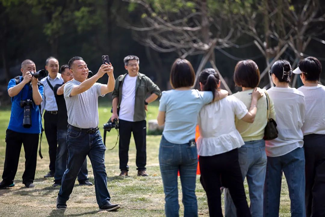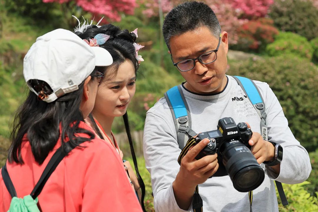 学员在德清县下渚湖奇幻谷景区拍摄杜鹃花海并与游客互动交流。河南日报聂冬晗 摄