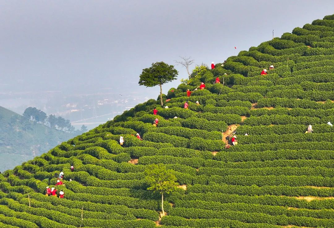 2025年4月7日,“绿水青山就是金山银山”理念诞生地——浙江湖州,采茶工在如画般的茶园采摘茶叶。盱眙县融媒体中心 许昌银摄