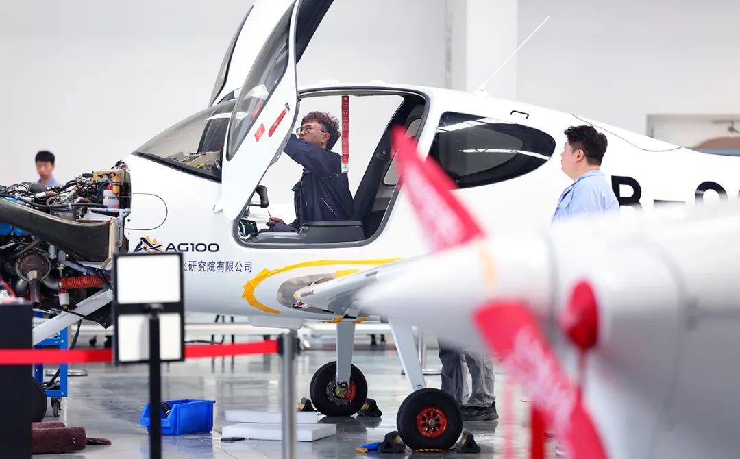 2025年4月10日,浙江中航通飞研究院有限公司内,技术人员正在车间组装AG100小型飞机,这是国产新一代民用初级教练机??破帐北敬汉?摄