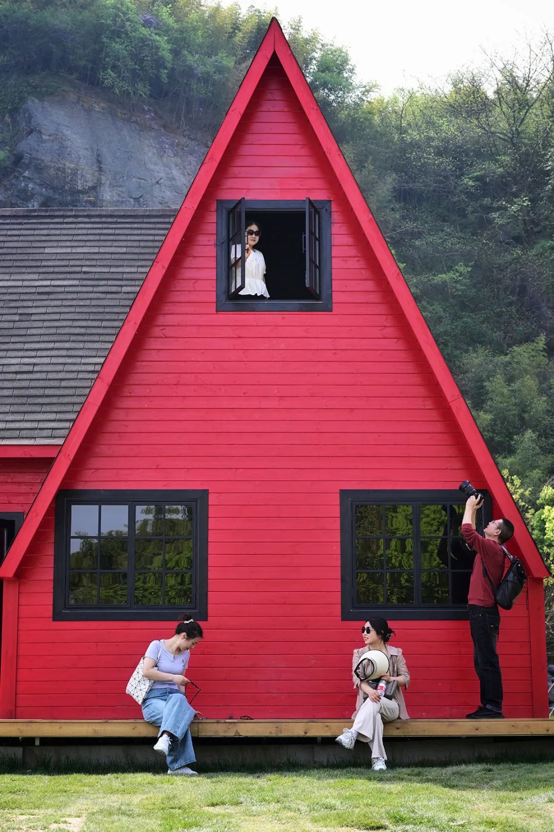 2025年4月10日,德清县莫干山镇五四村的格里恩咖啡,游客们在景区的红房子前休息、拍照。 南充市融媒体中心 吴小蓉摄