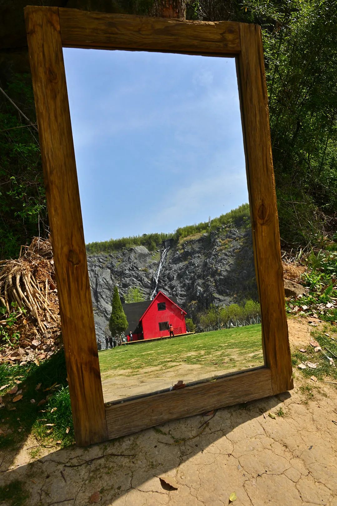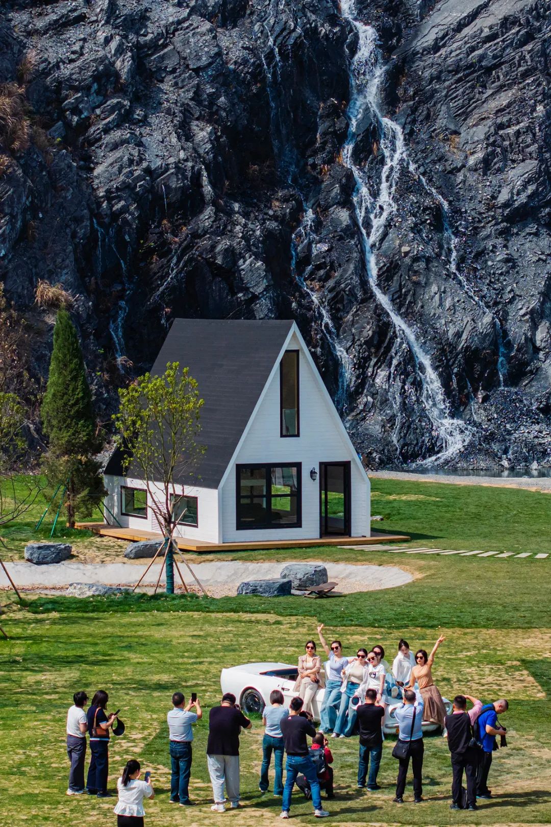 2025年4月10日,游客在德清县格里恩咖啡店人造景观前拍照。位于莫干山镇五四村的格里恩咖啡项目,通过盘活闲置矿山资源,打造了大草坪、人工瀑布、北欧风木屋等景观,成为热门打卡地。新华日报蒋文超 摄