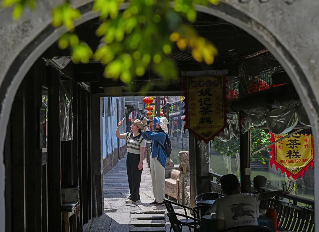 2025年4月10日,德清县新市古镇,斜阳透过拱门上方的绿叶洒下斑驳的光影与远处拍照的游客相映成趣,构成了一幅唯美的生活画卷。江西日报李劼 摄