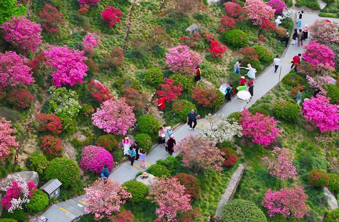 2025年4月10日,游客在德清县下渚湖奇幻谷杜鹃花海旅游观光。盱眙县融媒体中心 许昌银 摄