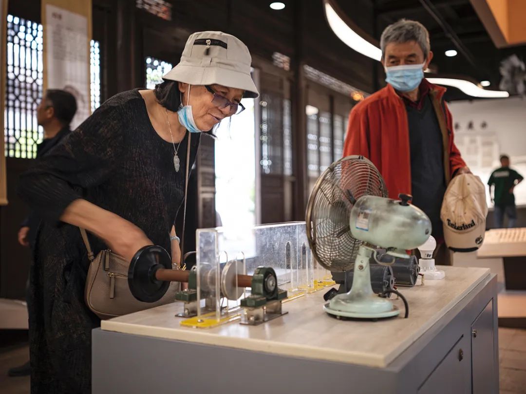 2025年4月10日,德清县新市古镇,一位老人在“中国电机之父”钟兆琳故居内体验手摇发电机。上海市闵行区融媒体中心 徐恺凯摄