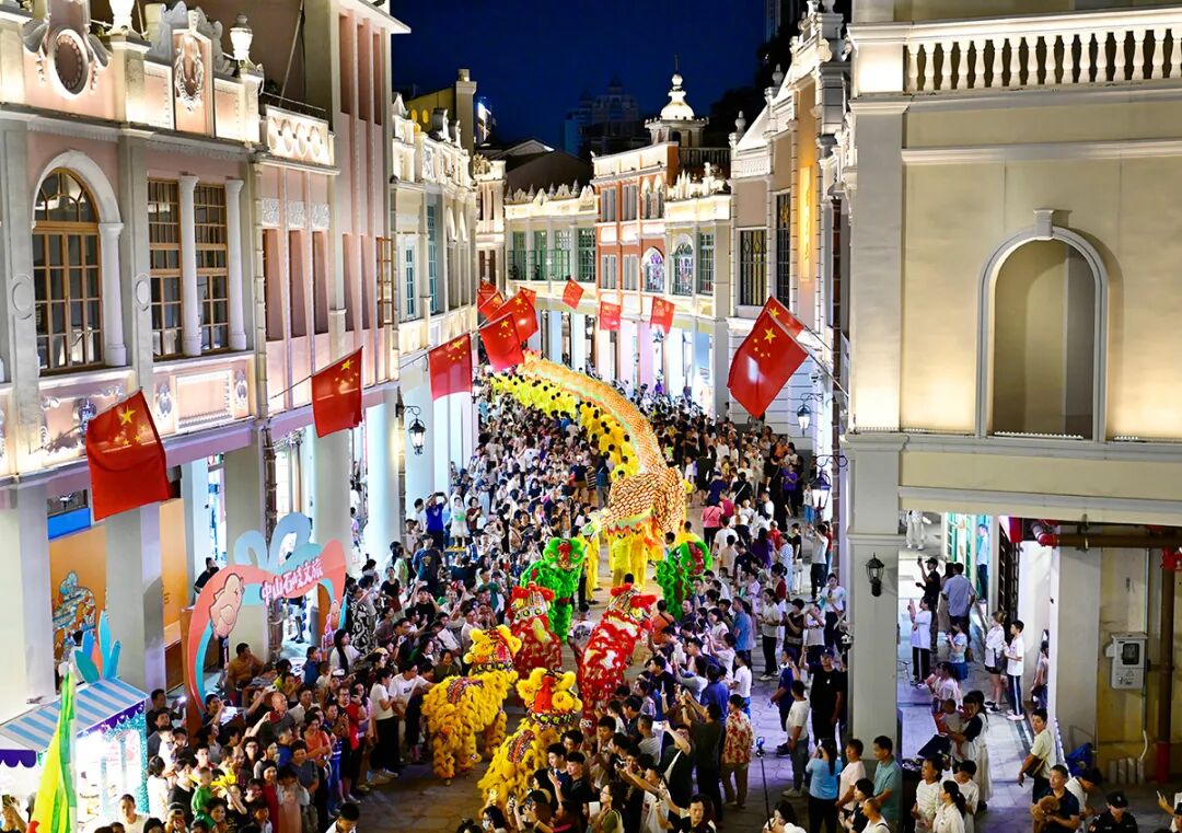 2025年10月1日,广东中山,古镇六坊金龙、三角麒麟等等中山非遗项目悉数亮相,入夜后在步行街巡游,吸引大批市民游客围观。 中山日报记者 余兆宇 摄