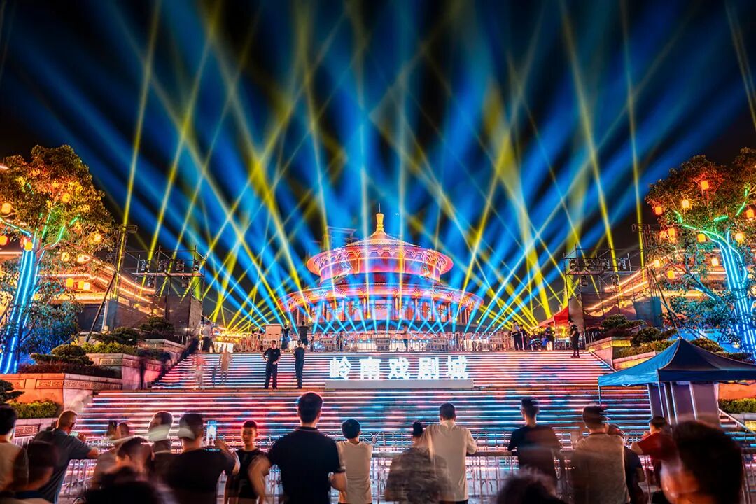 2025年9月30日晚,广东中山,游客在岭南戏剧城观看灯光展演。中山日报见习记者 张景天摄