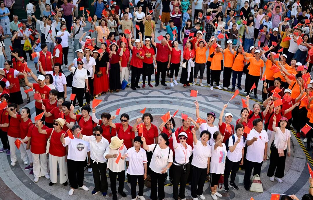 2025年10月1日,广东中山,参与快闪活动的群众边唱边挥动手中小旗。中山日报记者 余兆宇摄