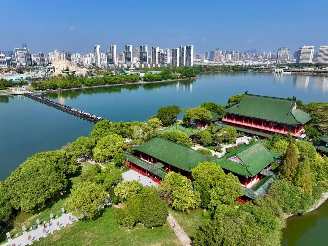 2025年9月28日,江西南昌,水系环绕、绿树成荫的豫章书院正式开放。作为南昌国庆期间重要文旅活动,豫章书院依托象湖湖心岛仿古建筑恢复而成,通过对岛上区域的建筑、环境等进行提升改造,打造了豫章堂、洪都厅、钟陵轩、隆兴斋、雅望亭等建筑。书院桥是南昌市首座钢架浮桥,202.8米的桥身由39艘钢浮船拼接而成,成为市民游客争相打卡的网红新地标。 南昌日报记者 刘惊天 摄