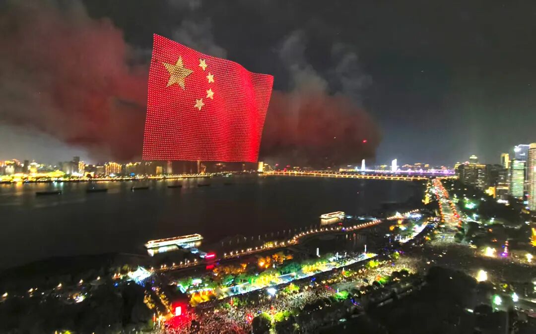 2025年10月1日晚,江西南昌,无人机在赣江上空打出五星红旗图案,礼赞祖国76年华诞。南昌日报记者 杨紫韬