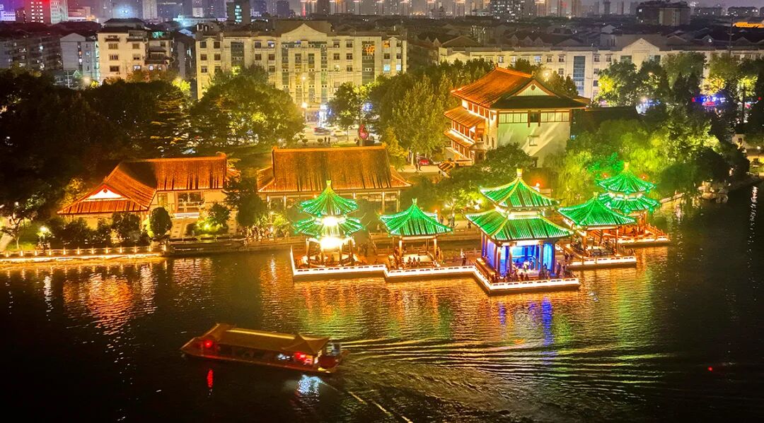 2025年10月1日晚,江苏南通濠河灯光璀璨,夜色迷人。众多各地游客乘船游览,沉浸式体验“濠河夜画” 。南通日报记者 许丛军 摄