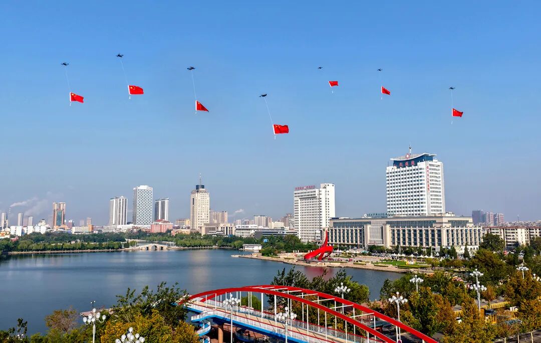 2025年9月30日,山东德州,七架无人机悬挂五星红旗,依次飞越京杭大运河德州段、具有“北方都江堰”之称的四女寺水利枢纽、长河公园等德州具有代表性的地标,礼赞祖国76周年华诞。 德州日报记者 周坤 摄