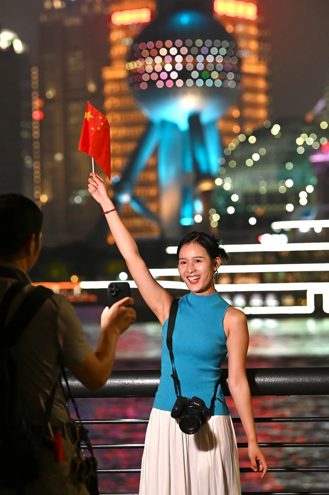 2025年9月30日,上海外滩,一位游客买了一面国旗,她让朋友帮她拍个视频,发社交媒体?!懊魈炀鸵炝耍朐诮吡粝乱桓黾湍??!彼怠?strong> 澎湃新闻记者 吴栋 摄
