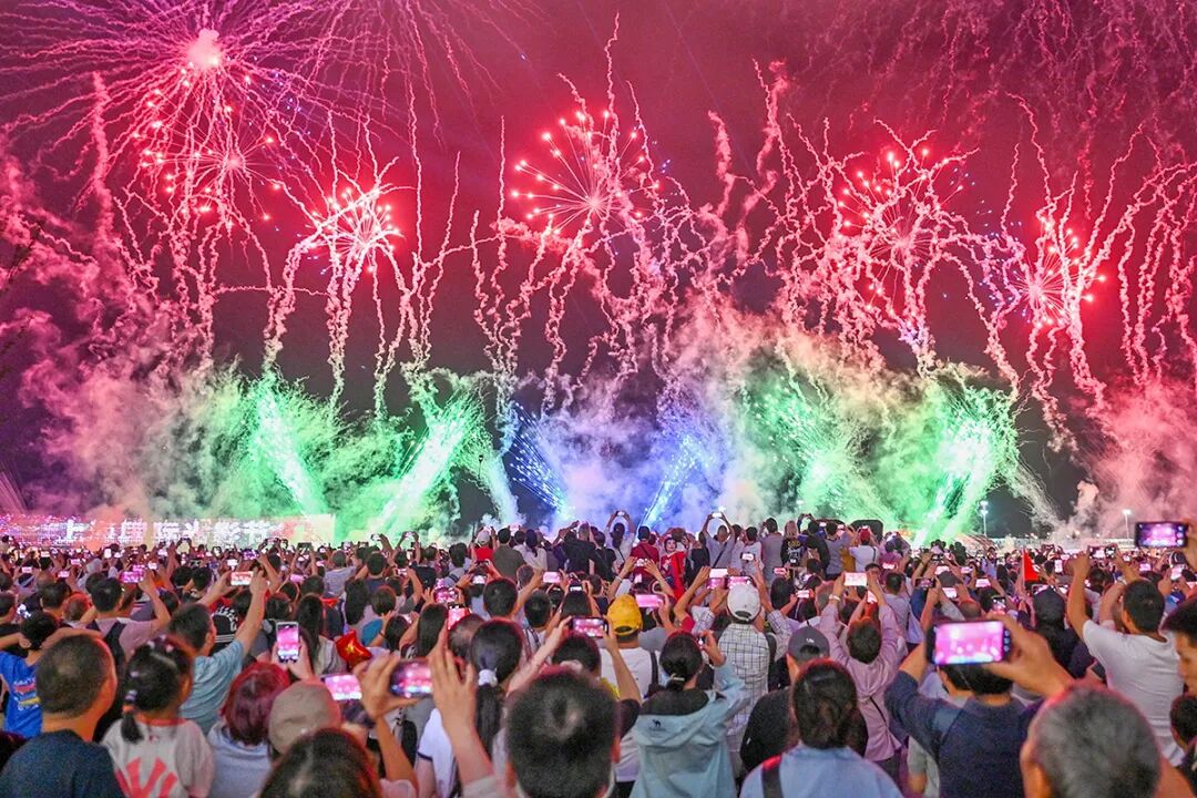 2025年10月1日晚,江苏省南通市通州区的洲际梦幻岛,大型梦幻烟花秀、激光音乐喷泉点亮夜空,吸引了众多休闲度假的游客欣赏、拍摄。 南通日报记者 许丛军摄