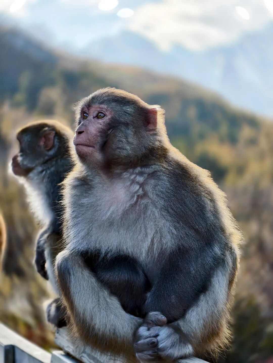 远眺夏诺多吉雪山,蓝天白云、雪山与彩林相互映衬