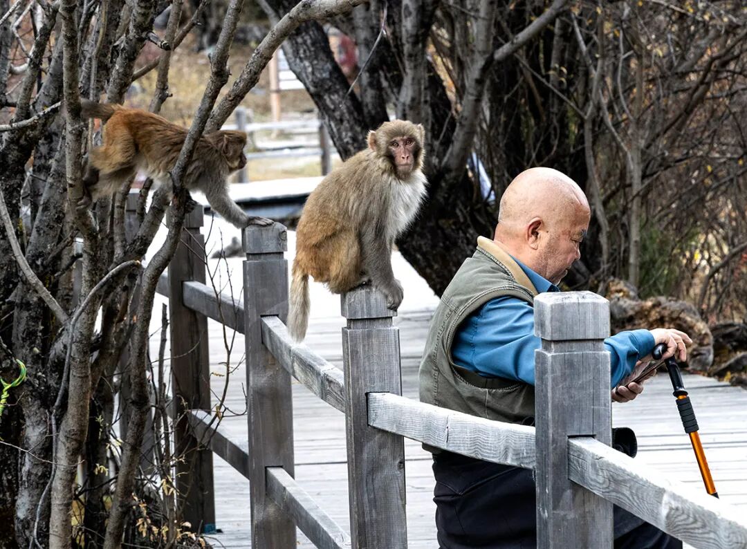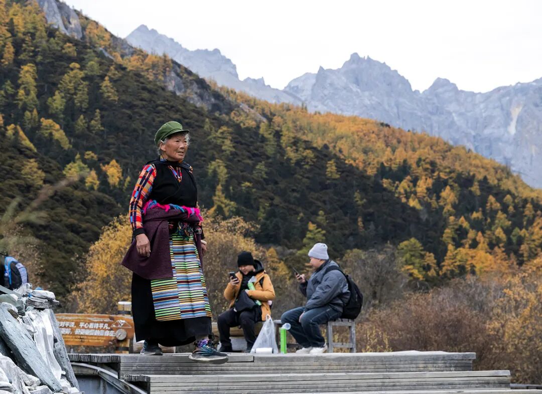 在稻城亚丁景区,游人沿着步行栈道靠近央迈勇雪山。