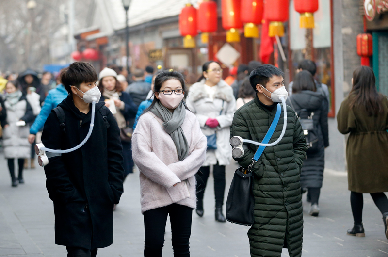 游客戴空气净化器口罩游览北京南锣鼓巷